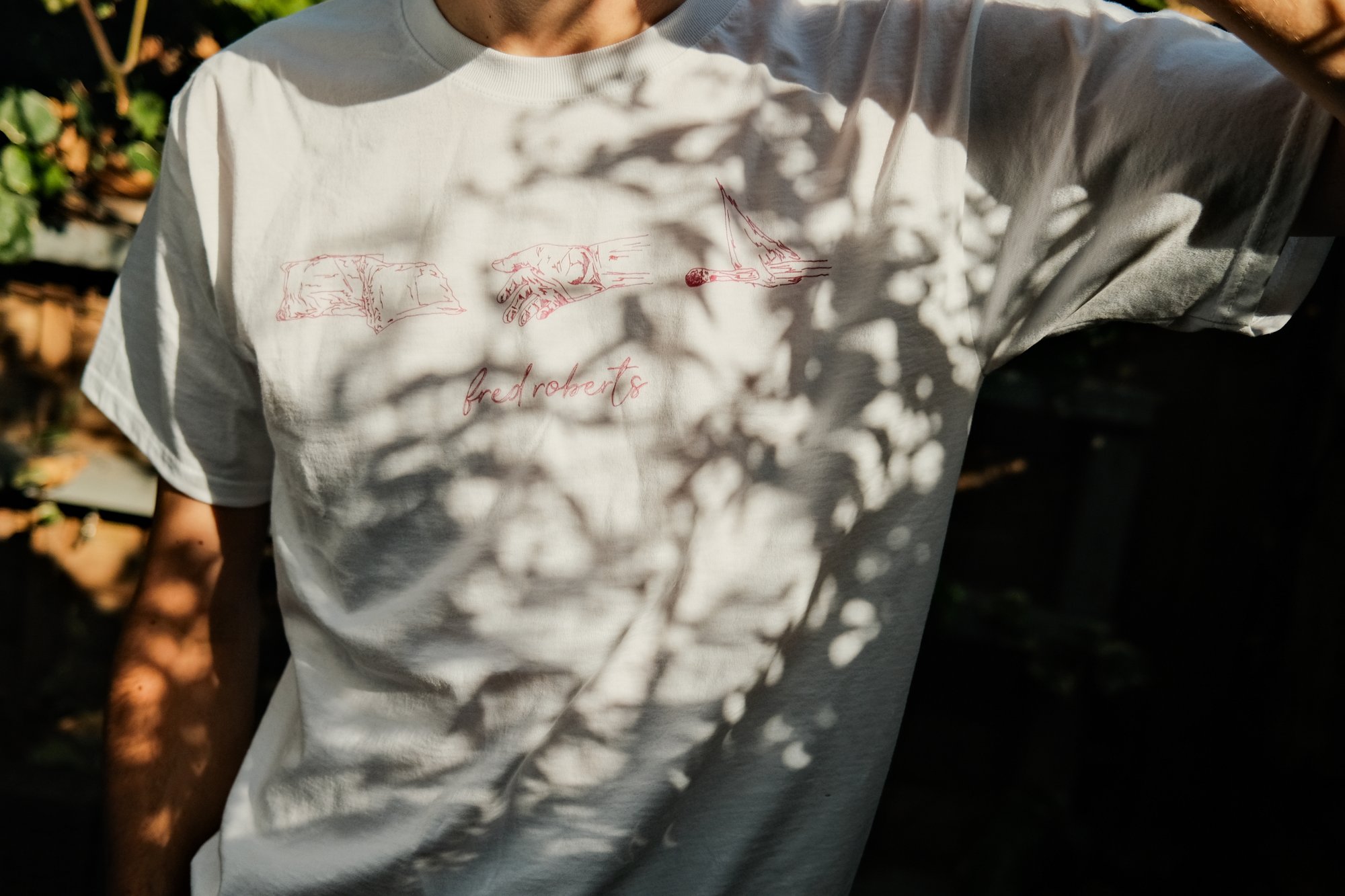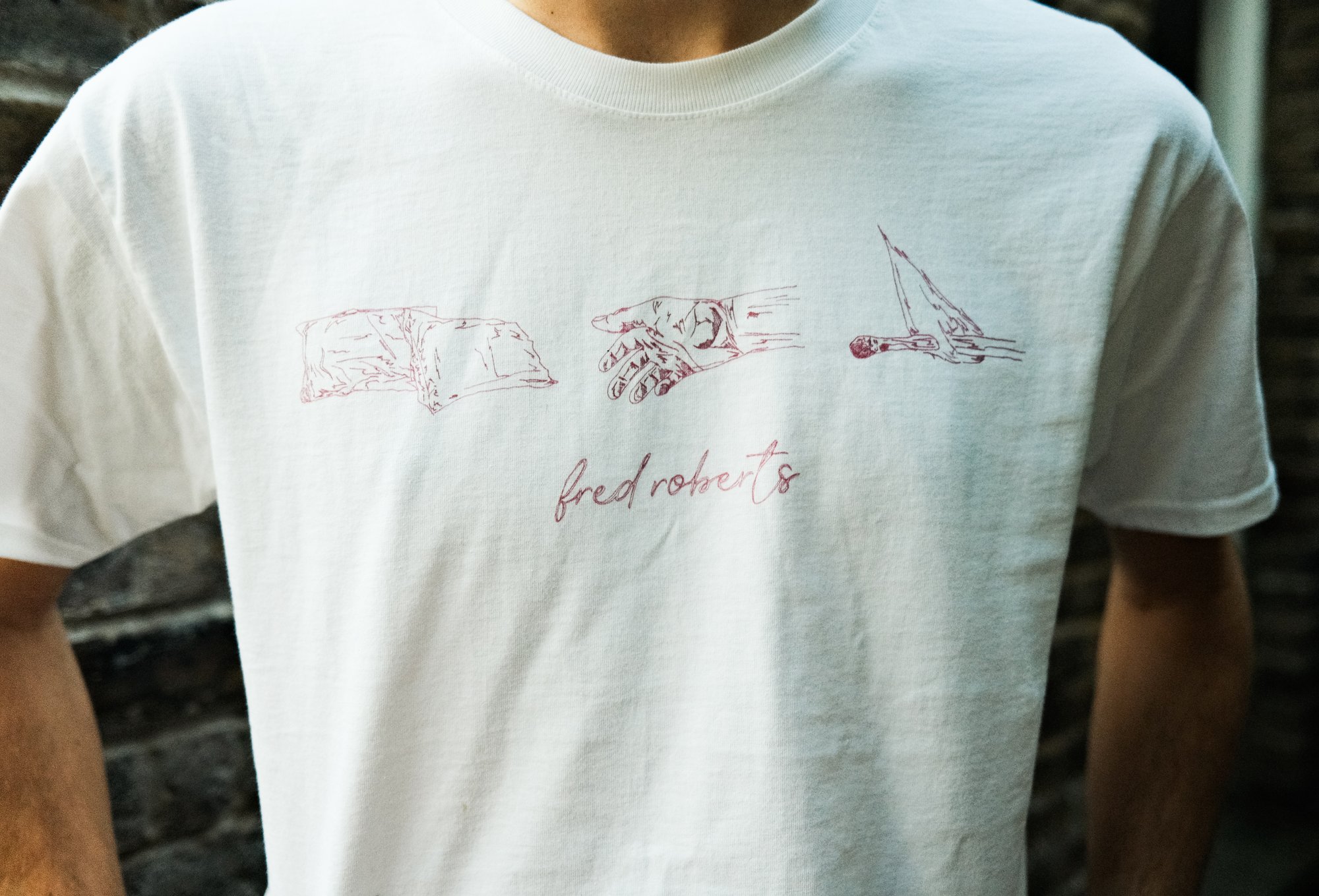 White T-shirt featuring three illustrations from the Object of Desire visualiser and a hand-drawn Fred Roberts logo. All purchases come with a personalised and signed Fred Roberts postcard - Please leave any notes in the checkout.